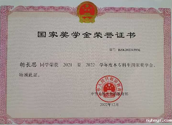 2022年12月,胡长思荣获2021至2022学年度国家奖学金