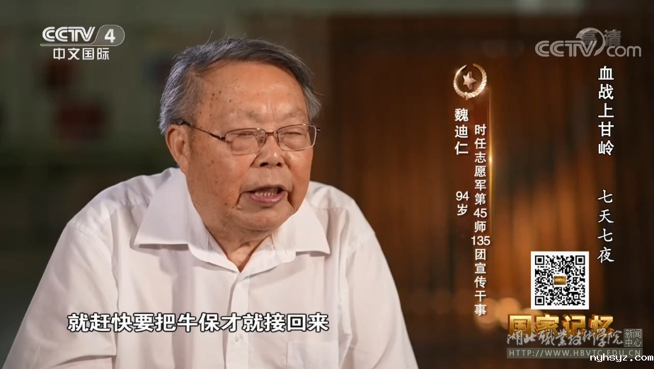 (本网讯 陈灏 熊元焕 黄璐 )近日,中央广播电视总台《国家记忆》栏目连续播出五集纪录片《血战上甘岭》,纪录片《血战上甘岭》第二集、第三集播出了我校教师、上甘岭战役亲历者、第三届全国道德模范提名奖获得者、第三届湖北省道德模范魏迪仁的采访。魏迪仁老师作为亲身经历者之一,以准确记忆、朴实语言、战友深情,讲述了抗美援朝战争上甘岭战役黄继光、孙占元等英雄群体的故事,真实还原了70年前那场震惊世界的战役,重温红色历史,赓续红色基因,传承伟大精神,激励学子争做时代新人。